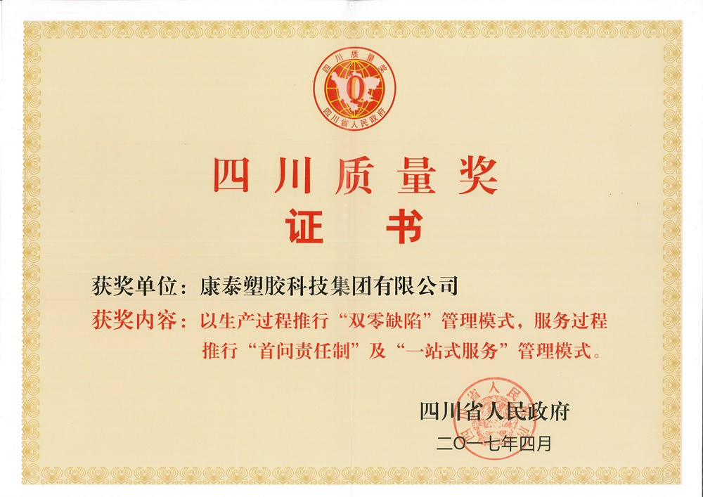 作為“四川質(zhì)量獎”的獲得者,康泰塑膠科技集團從創(chuàng )立以來(lái),一直致力于對產(chǎn)品的研發(fā)升級和質(zhì)量把控,不斷滿(mǎn)足客戶(hù)的需求。在康泰,公司建立了一整套質(zhì)量管控體系,以“圍繞全球顧客、不斷改善,追求產(chǎn)品零缺陷”的質(zhì)量方針,貫徹“產(chǎn)品如人品”的質(zhì)量理念,全面覆蓋ISO9001、ISO14001、OHSAS18001三體系,實(shí)施全員、全面質(zhì)量管理,通過(guò)導入PDCA循環(huán)管理和QCC體系,嚴格質(zhì)檢把控?!皥猿植缓细裨喜贿M(jìn)廠(chǎng)”,從源頭杜絕不合格產(chǎn)品的出現;“堅持不合格的產(chǎn)品不出廠(chǎng)”,從生產(chǎn)流程上杜絕不合格產(chǎn)品的出現,確保產(chǎn)品各項質(zhì)量指標均達到或優(yōu)于國家標準,讓用戶(hù)滿(mǎn)意。