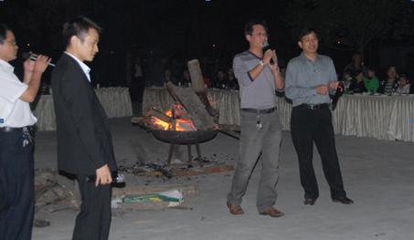 晚宴后,大家紛紛來(lái)到戶(hù)外,圍著(zhù)篝火舉杯歡唱,在主持人幽默詼諧的帶領(lǐng)下,參與互動(dòng)的員工熱情高昂?;顒?dòng)一直持續到晚上10點(diǎn),大家仍然意猶未盡。